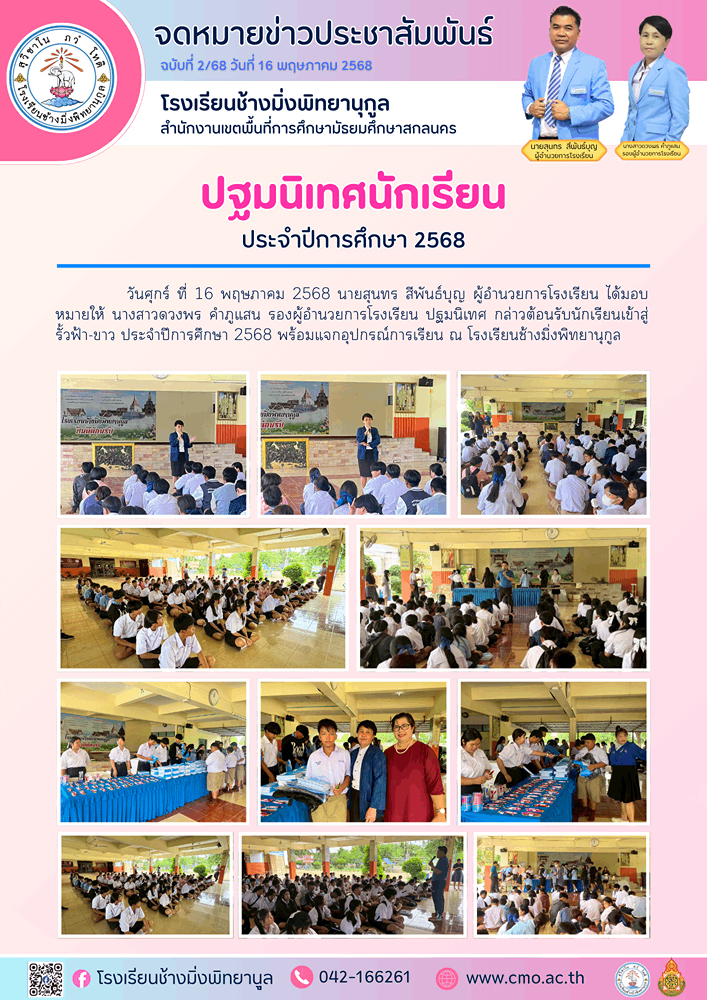 | วันศุกร์ ที่ 16 พฤษภาคม 2568 นายสุนทร สีพันธ์บุญ ผู้อำนวยการโรงเรียน ได้มอบหมายให้ นางสาวดวงพร คำภูแสน รองผู้อำนวยการโรงเรียน ปฐมนิเทศ กล่าวต้อนรับนักเรียนเข้าสู่รั้วฟ้า-ขาว ประจำปีการศึกษา 2568 พร้อมแจกอุปกรณ์การเรียน ณ โรงเรียนช้างมิ่งพิทยานุกูล |