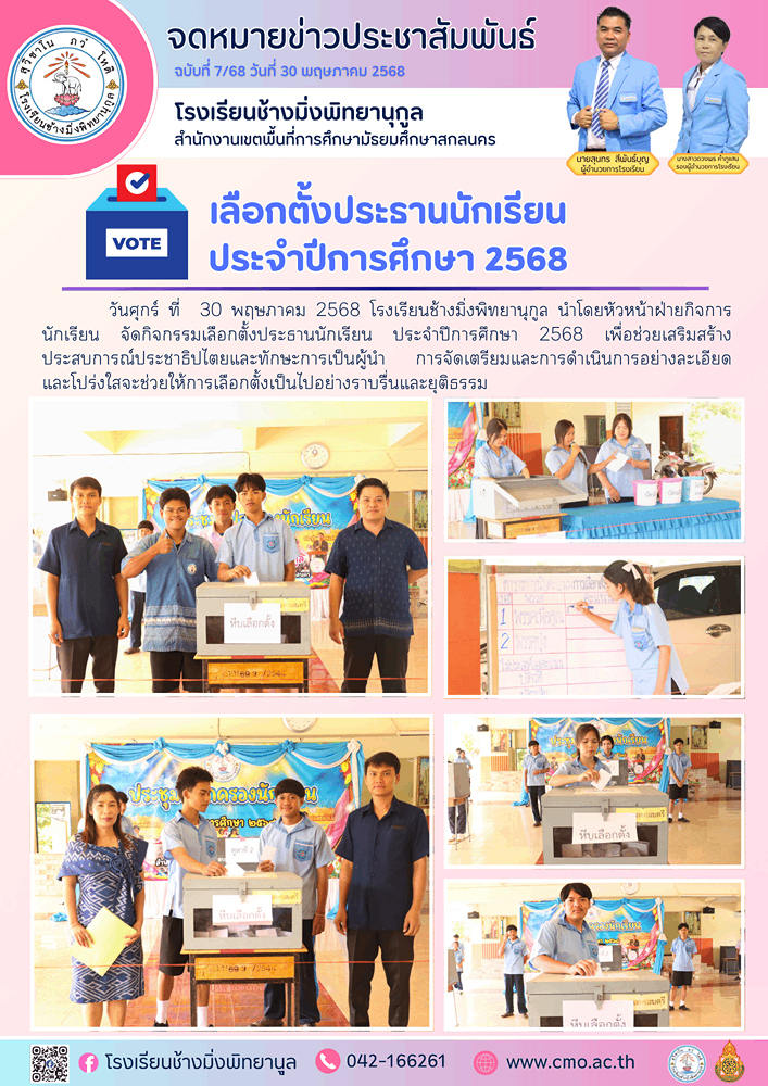 | วันศุกร์ ที่ 30 พฤษภาคม 2568 โรงเรียนช้างมิ่งพิทยานุกูล นำโดยหัวหน้าฝ่ายกิจการนักเรียน จัดกิจกรรมเลือกตั้งประธานนักเรียน ประจำปีการศึกษา 2568 เพื่อช่วยเสริมสร้างประสบการณ์ประชาธิปไตยและทักษะการเป็นผู้นำ การจัดเตรียมและการดำเนินการอย่างละเอียดและโปร่งใสจะช่วยให้การเลือกตั้งเป็นไปอย่างราบรื่นและยุติธรรม |