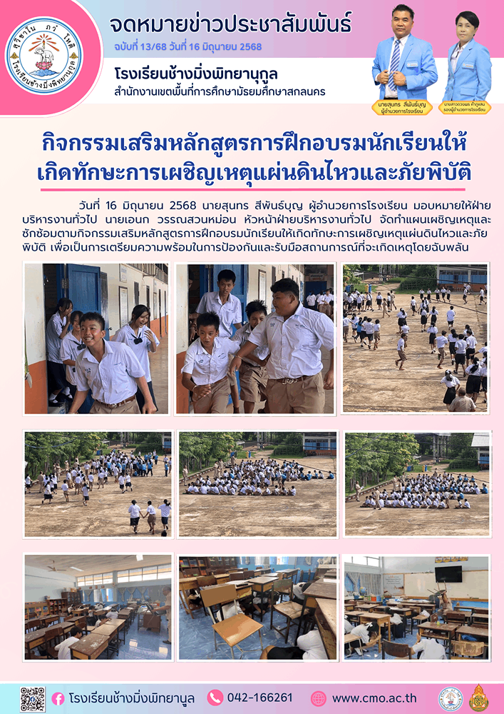 | วันที่ 16 มิถุนายน 2568 นายสุนทร สีพันธ์บุญ ผู้อำนวยการโรงเรียน มอบหมายให้ฝ่ายบริหารงานทั่วไป นายเอนก วรรณสวนหม่อน หัวหน้าฝ่ายบริหารงานทั่วไป จัดทำแผนเผชิญเหตุและซักซ้อมตามกิจกรรมเสริมหลักสูตรการฝึกอบรมนักเรียนให้เกิดทักษะการเผชิญเหตุแผ่นดินไหวและภัยพิบัติ เพื่อเป็นการเตรียมความพร้อมในการป้องกันและรับมือสถานการณ์ที่จะเกิดเหตุโดยฉับพลัน |