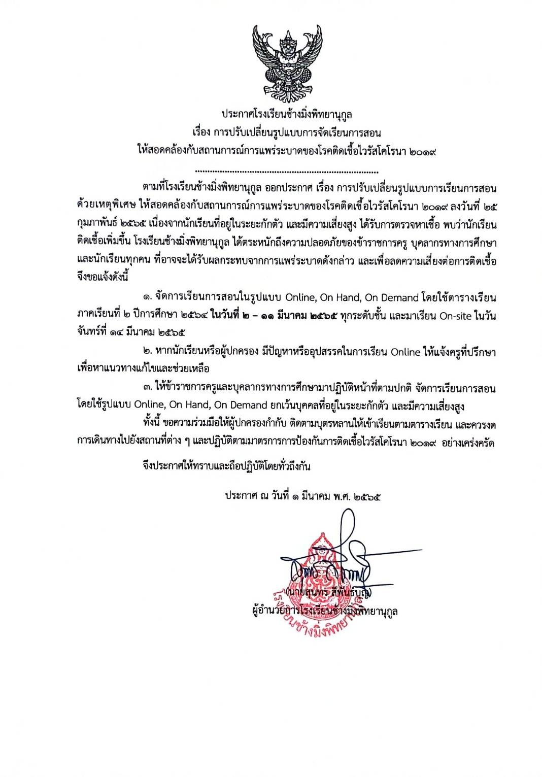 ประกาศโรงเรียนช้างมิ่งพิทยานุกูล เรื่อง การปรับเปลี่ยนรูปแบบการเรียนการสอน