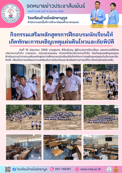 กิจกรรมเสริมหลักสูตรการฝึกอบรมนักเรียนให้เกิดทักษะการเผชิญเหตุแผ่นดินไหวและภัยพิบัติ