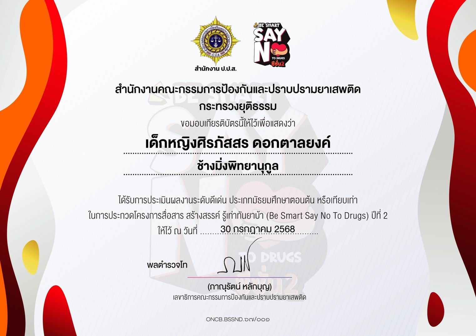 ชื่อผลงาน : ได้รับการประเมินผลงานระดับดีเด่น ประเภทมัธยมศึกษาตอนต้น หรือเทียบเท่า ในการประกวดโครงการสื่อสาร สร้างสรรค์ รู้เท่าทันยาบ้า (Be Smart Say No To Drugs) ปีที่ 2