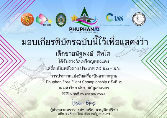 ได้รับรางวัลเหรียญทองแดง เครื่องบินพลังยาง ประเภท 3D ม.๑ - ม.๖ การประกวดแข่งขันเครื่องบินอากาศยาน Phuphan Free Flight Championship ครั้งที่ ๒