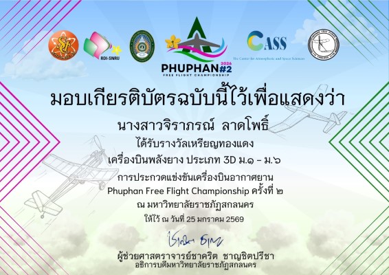 ได้รับรางวัลเหรียญทองแดง เครื่องบินพลังยาง ประเภท 3D ม.๑ - ม.๖ การประกวดแข่งขันเครื่องบินอากาศยาน Phuphan Free Flight Championship ครั้งที่ ๒ |