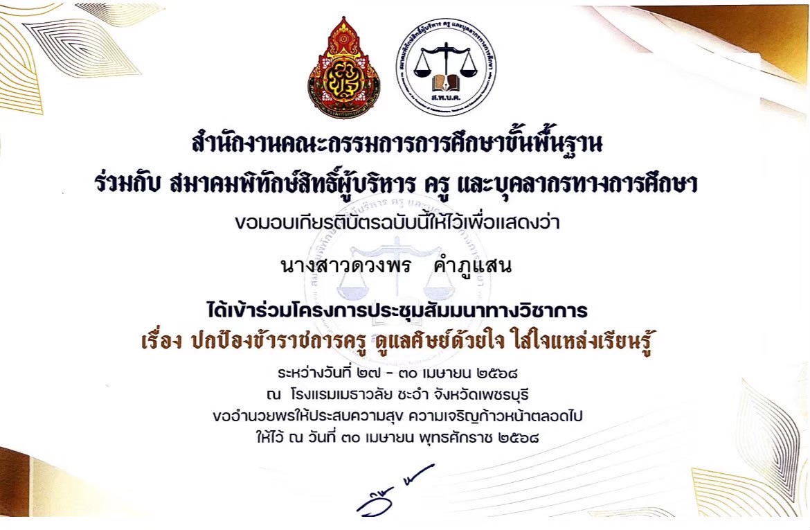 ชื่อผลงาน : ได้เข้าร่วมโครงการประชุมสัมมนาทางวิชาการ เรื่อง ปกป้องข้าราชการครู ดูแลศิษย์ด้วยใจ ใส่ใจแหล่งเรียนรู้