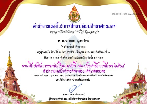 ครูที่ปรึกษาทีมที่ได้รับการประเมินผลงานระดับดีเด่น ประเภทมัธยมศึกษาตอนต้น หรือเทียบเท่า ในการประกวดโครงการสื่อสาร สร้างสรรค์ รู้เท่าทันยาบ้า (Be Smart Say No To Drugs) ปีที่ 2 |